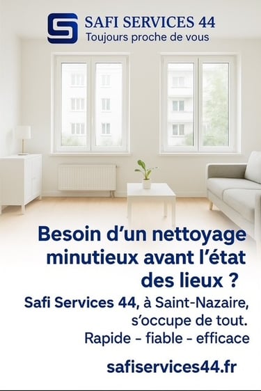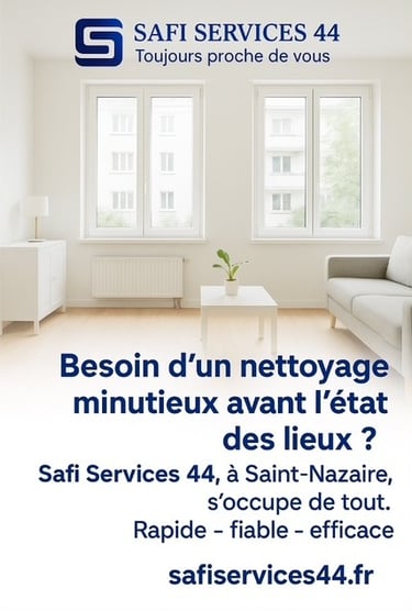 Safi Services 44 est une entreprise spécialisée dans le nettoyage avant état des lieux, à l’entrée comme à la sortie. Basée à Saint-Nazaire, elle intervient dans un rayon opérationnel de 20 km pour offrir un service fiable et soigné, garantissant la propreté et la tranquillité d’esprit de ses clients lors de la remise ou de la reprise de logements.